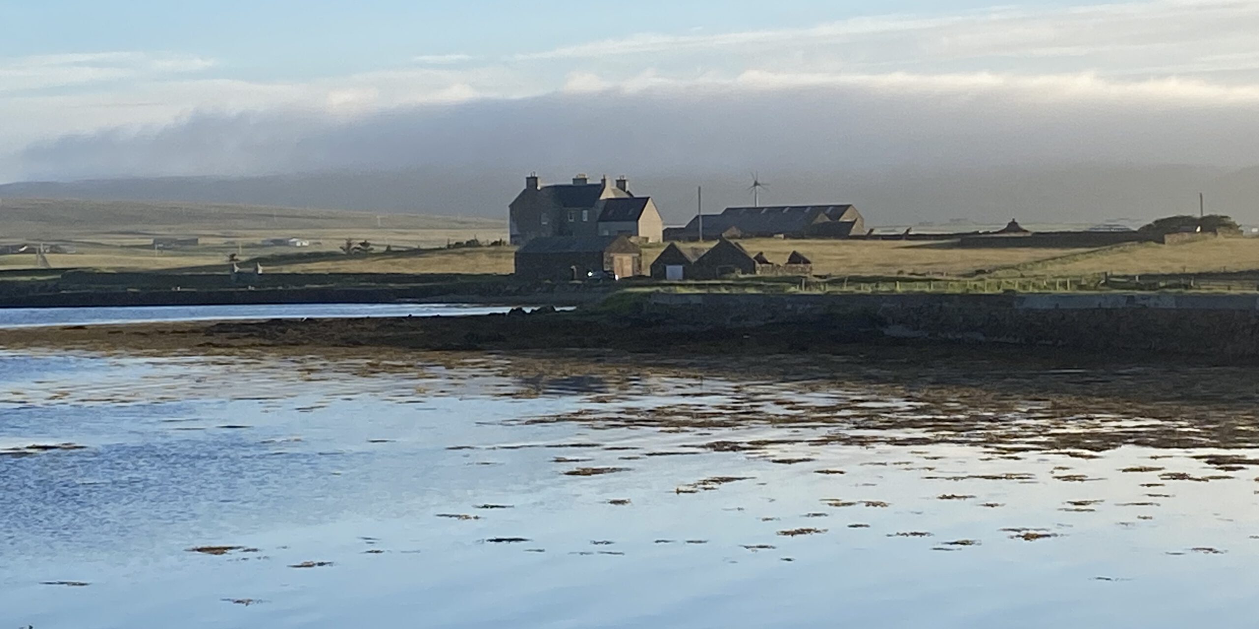 Wir biegen ein in den Auskerry Sound. Der Strom von hinten setzt ein und schiebt. Kurz danach überqueren wir noch die 9 Meilen über den Stronsay Firth. Hier schläft der Wind auf der Mitte ein. Wir starten die Maschine.